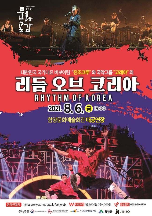 [시사뉴스 정윤철 기자] 함양군 문화예술회관은 비보이팀 ‘진조크루’와 국악 월드뮤직그룹 ‘고래야’의 협연공연 ‘리듬 오브 코리아’를 오는 8월 6일 오후 7시 문화예술회관 대공연장에서 선보인다.