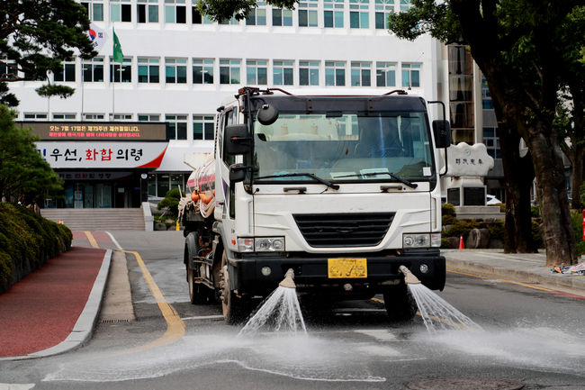 살수차를 운행하면 약 3℃의 체감온도 감소 효과는 물론 도로에 쌓인 미세먼지를 제거하여 대기질 개선효과가 있다.