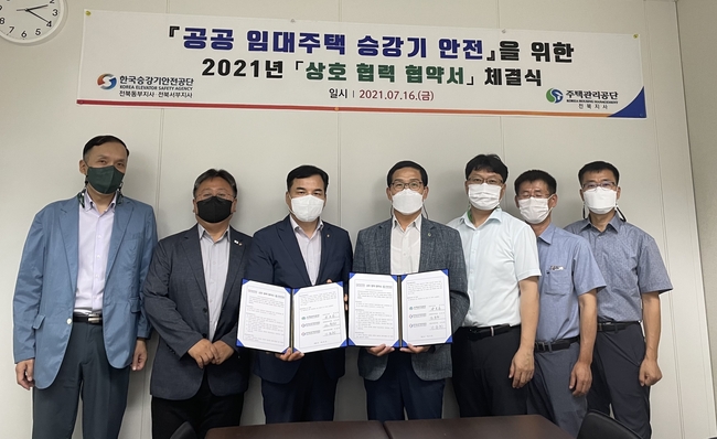 [시사뉴스 정윤철 기자] 한국승강기안전공단(이하 공단) 전북동부지사와 전북서부지사는 전북지역 공공임대주택 승강기 안전을 위해 주택관리공단 전북지사와 16일 업무협약을 체결했다.