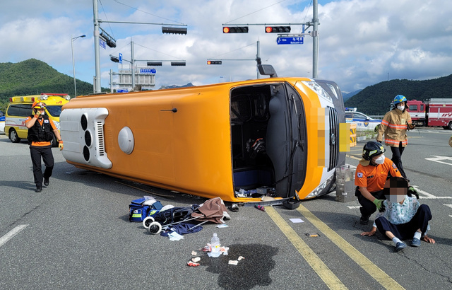 화물차와 충돌한 버스 전도, 크고 작은 부상