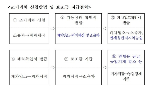 신청대상은 농업경영체에 등록한 농업인과 농업법인이며, 지원대상 농기계는 농협 ‘면세유 관리시스템’ 기준 등록된 2013년 이전(‘12. 12.31.) 생산된 경유 트랙터·콤바인에 한한다.