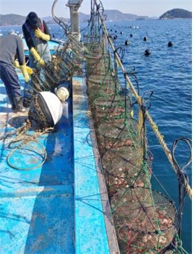 동절기동안 성장한 참가리비는 5월부터 출하가 시작되면 그 빈 공간에 해만가리비 치패를 넣기 시작해 6월에 참가리비가 모두 출하되면 해만가리비를 소분(小分)해 본격적인 양식을 하게 된다.