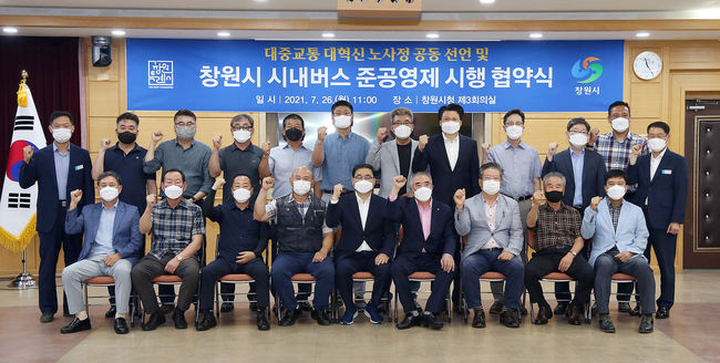 [시사뉴스 정윤철 기자] 창원시(시장 허성무)는 26일 오전 시청 제3회의실에서 창원시 시내버스 9개사 노사 대표가 참석한 가운데 시내버스 준공영제를 시행협약을 체결했다. 이번 협약으로 시가 대중교통 정책의 최우선 목표로 역점 추진되는 시내버스 준공영제는 오는 9월 1일부터 시행된다.