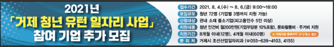 [시사뉴스 정윤철 기자] 거제시(시장 변광용)는 26일 기업의 인력난 해소 및 지역 청년의 일자리 창출을 위해 2020년부터 추진 중인 ‘거제 청년 유턴 일자리 사업’ 참여기업을 추가 모집한다고 밝혔다.