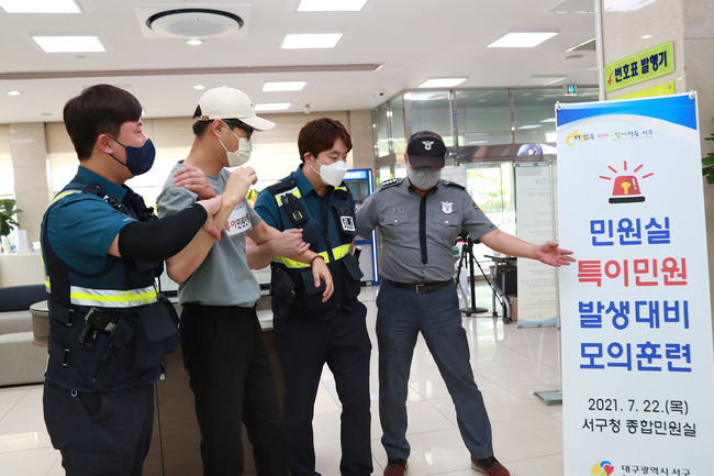 [시사뉴스 강준민 기자] 대구 서구청(구청장 류한국)은 안전한 근무환경 조성을 위해 지난 22일 민원실에서 특이민원 발생상황을 가정한 비상대응 모의훈련을 실시했다.