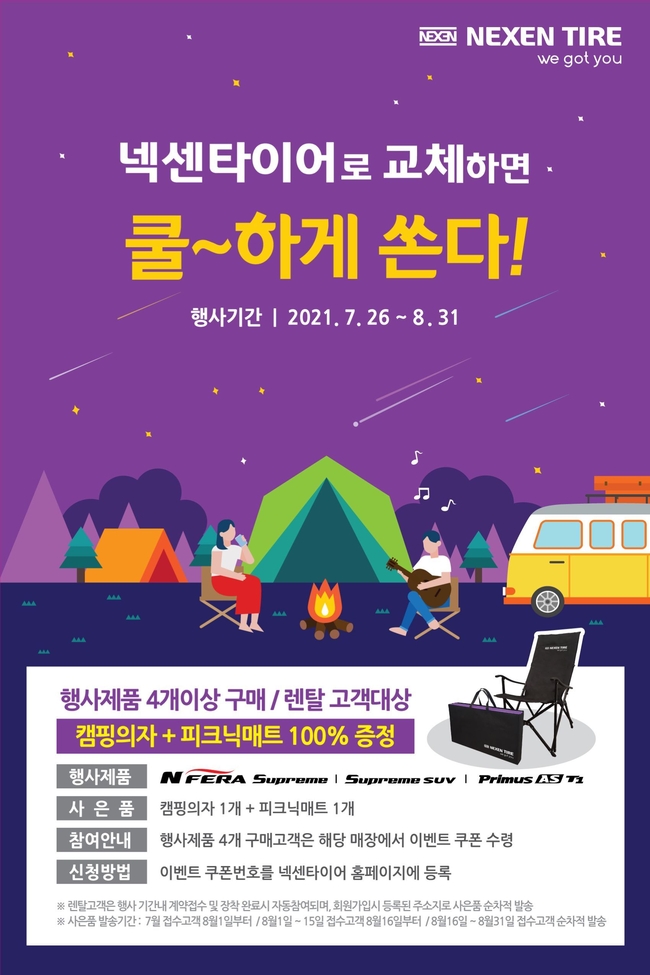 7월 26일부터 8월 31일까지 행사 제품 4개를 구매 및 렌탈하는 고객에게 ‘캠핑 의자와 피크닉 매트’로 교환 할 수 있는 쿠폰을 증정한다. 사회적 거리 두기로 최근 수요가 증가하고 있는 캠핑 및 차박과 관련한 트렌드를 반영했다. 쿠폰 번호를 넥센타이어 홈페이지 내 이벤트 페이지에 입력하면 주소지로 사은품이 배송된다.