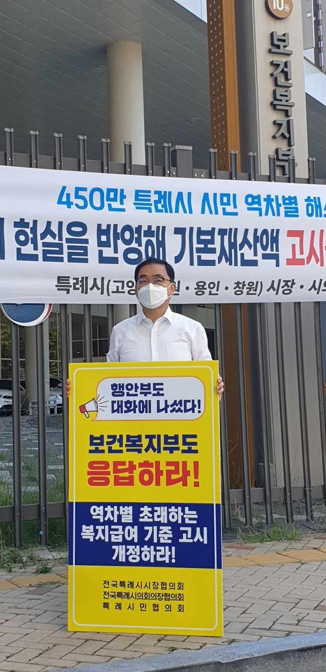 [시사뉴스 정윤철 기자] 허성무 창원시장(전국특례시시장협의회 대표회장)은 27일 오전 10시 세종시 보건복지부 청사 앞에서 1인 시위에 돌입했다. 지난 14일 이어 이달 들어서만 두 번째다.