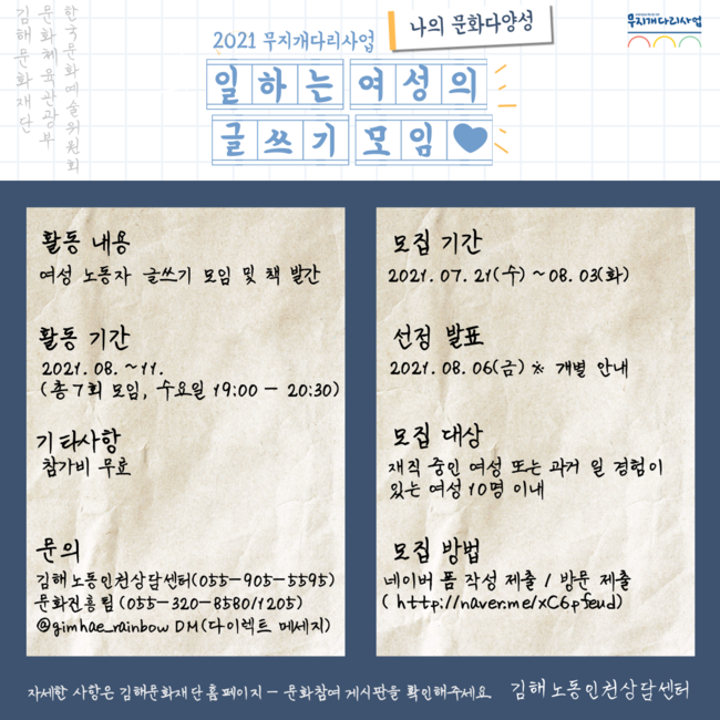 [시사뉴스 정윤철 기자] (재)김해문화재단은 2021 무지개다리사업 일환으로 진행하는 ‘나의 문화다양성 사업’의 '여성 노동자 글쓰기 모임' 참여자를 오는 8월 3일까지 모집한다.