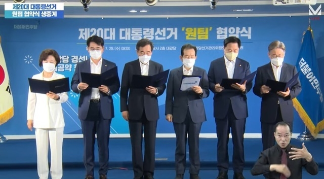 민주당은 네거티브 공방이 격화하는 것을 막기 위해 '서로 정정당당하게 선의의 경쟁을 펼치는 동시에 존중하고 협력하는 원팀이 되겠다'고 다짐하는 후보 간 원팀 협약식을 마련했다.