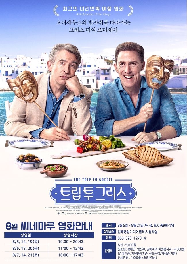 영화 '트립 투 그리스'는 오는 8월 5일부터 21일까지 매주 목, 금, 토요일 총 9회 상영되며, 자세한 일정은 김해문화의전당 영상미디어센터 홈페이지에서 확인할 수 있다.