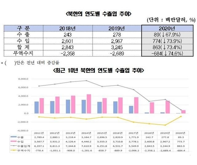 유엔 대북제재 지속, 코로나19로 인한 국경 봉쇄 등으로 인해 수출과 수입 모두 큰 폭으로 감소한 데 따른 결과라는 분석이다.