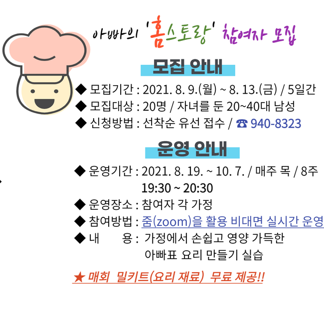 [시사뉴스 정윤철 기자] 거창군은 오는 9일부터 13일까지 5일간 비대면 라이브 요리교실 ‘아빠의 홈스토랑’ 대상자를 선착순 모집한다고 밝혔다.