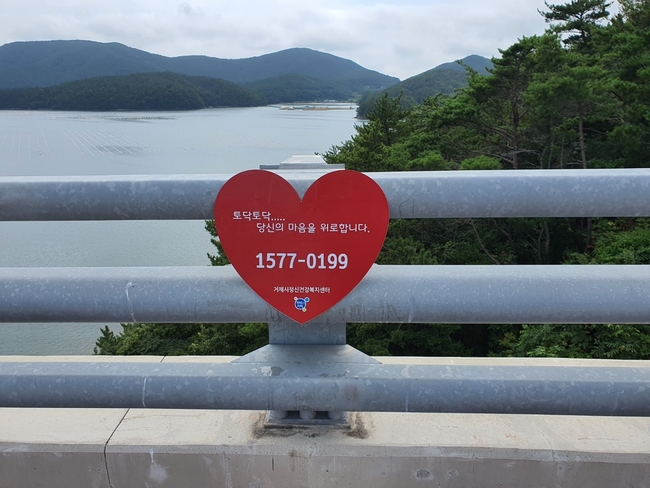 자살예방 안내판은 마음이 따뜻해지는 문구와 함께 정신건강위기상담 안내전화가 명시되어 있고 구 거제대교, 가조연륙교, 칠천연륙교, 황덕교, 산달연륙교에 위치해 있다.