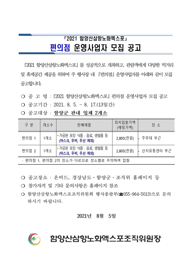 [시사뉴스 정윤철 기자] 함양산삼항노화엑스포조직위원회(위원장 하병필 도지사권한대행)는 ‘2021 함양산삼항노화엑스포’ 편의점 운영사업자를 5일부터 오는 17일까지 모집한다고 밝혔다.