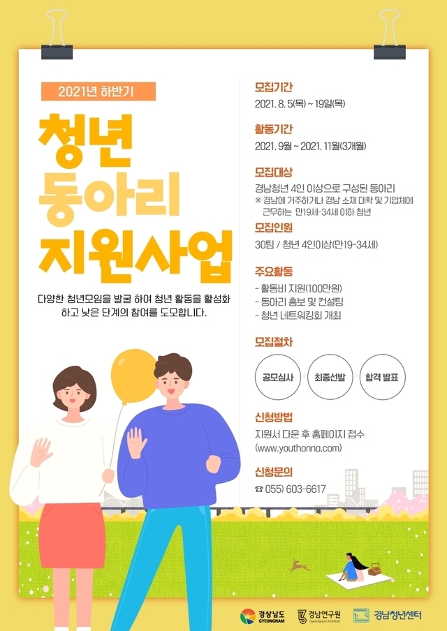 [시사뉴스 김도영 기자] 경남도와 경남청년센터는 다양한 청년 모임을 발굴·지원하는 '2021년 하반기 동아리활동 지원사업' 참여자를 오는 19일까지 모집한다고 8일 밝혔다.