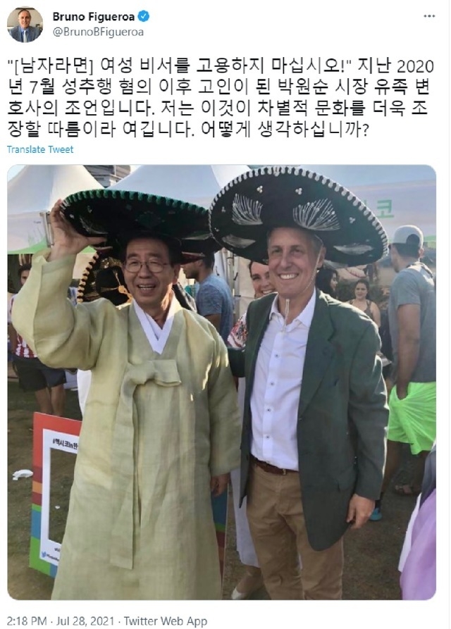 8일 사회관계망서비스(SNS)를 보면 브루노 피게로아 주한 멕시코 대사는 지난달 28일 자신의 SNS에 "[남자라면] 여성 비서를 고용하지 마십시오! 지난 2020년 7월 성추행 혐의 이후 고인이 된 박원순 시장 유족 변호사의 조언"이라고 소개했다.