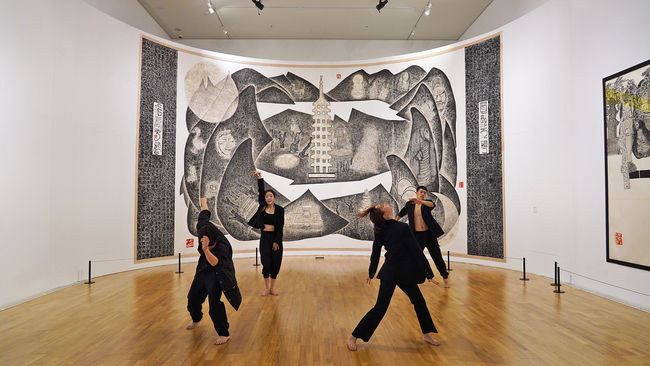 ‘산모롱이 느린 선 하나’ 전시가 진행되고 있는 1~5전시관을 차례로 순회하며 박대성과 김선두, 서용, 이은호, 이애리 등 작가의 개성이 뚜렷하게 담긴 작품들에서 느낀 점을 아름다운 몸놀림의 무용으로 창작해 표현하고 판소리와 스토리텔링을 입혀 환상적인 무대로 꾸몄다.