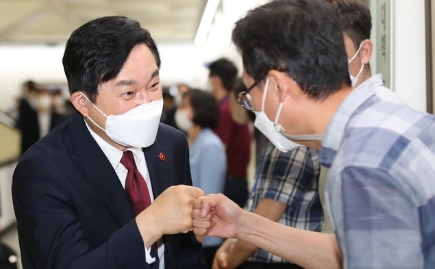 도청 복도 나온 공직자와 주먹인사