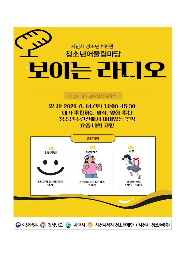 [시사뉴스 정윤철 기자] 사천시 복지・청소년재단의 소속인 청소년수련관이 ‘보이는 라디오 유튜브 방송-청소년어울림마당’으로 사천시민과 청소년들을 만난다고 12일 밝혔다.