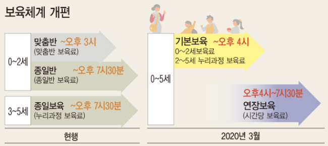 부모가 취업, 돌봄 등이 추가로 필요할 때만 12시간 종일반을 이용할 수 있었던 이전 보육체계와 달리 지난해 3월부턴 모든 아동에게 오후 4시까지 기본보육, 이후 연장보육이 제공되고 있다.