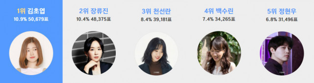 이어 2위는 4만8375표(10.4%)를 받은 장류진 작가가 차지했으며, 천선란 작가가 3만9181표(8.4%)로 그 뒤를 이어 3위에 올랐다.