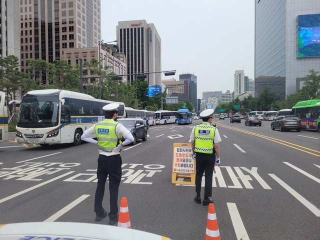 이들은 시청에서 광화문 방면으로 향하는 차량들을 살펴봤다. 오전 9시40분 기준 종로구 관내 10개 검문소에서 집회 시위 차량으로 의심돼 회차한 차량은 1대인 것으로 알려졌다.