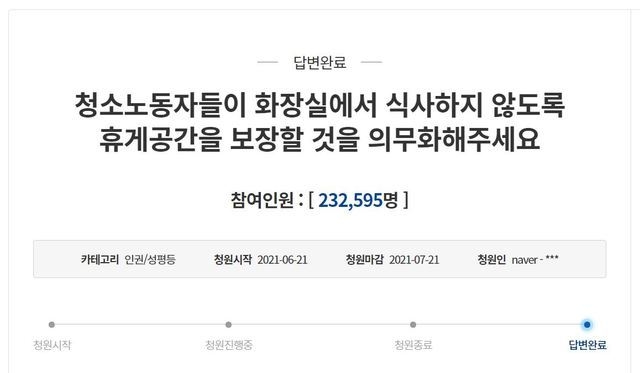 앞서 청원인은 지난 6월 '청소노동자들이 화장실에서 식사하지 않도록 휴게공간을 보장할 것을 의무화해주세요'라는 제목의 글에서 적절한 휴게시설이 없어 화장실에서 식사하는 열악한 청소노동자의 노동환경을 지적하며 냉난방과 환기, 편의시설을 보장한 실질적 휴게공간 의무화 등을 요구했다. 해당 글은 한 달간 23만2595명이 동의해 답변 기준을 총족했다.