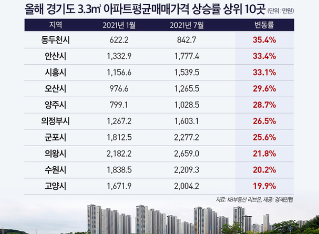 18일 부동산 정보업체 '경제만랩'이 KB리브부동산 자료를 분석한 결과, 올해 1월 동두천의 3.3㎡당 아파트 평균매매가격은 622만원이었는데 7월에는 842만원으로 35.4% 상승했다.