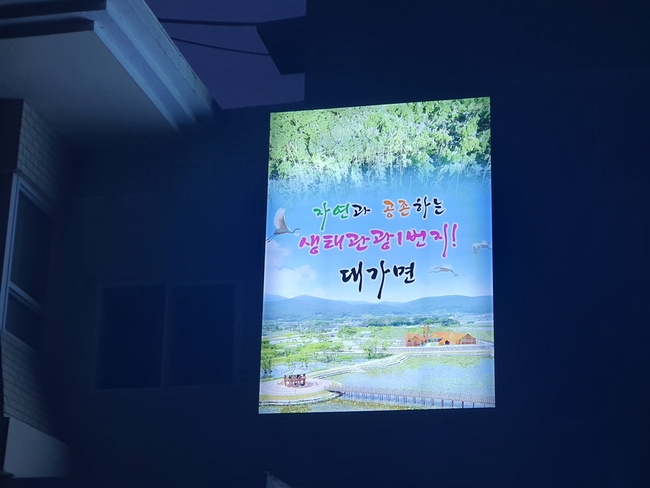 대가면 연꽃테마공원과 어우러진 제정구 커뮤니티센터와 암전마을 백로집단서식지를 배경으로 ‘자연과 공존하는 생태관광 1번지 대가면’이라는 문구를 담아 대가면의 우수한 생태관광자원을 널리 알리고, 조명장치를 설치해 야간에도 홍보 효과를 극대화하도록 제작됐다.