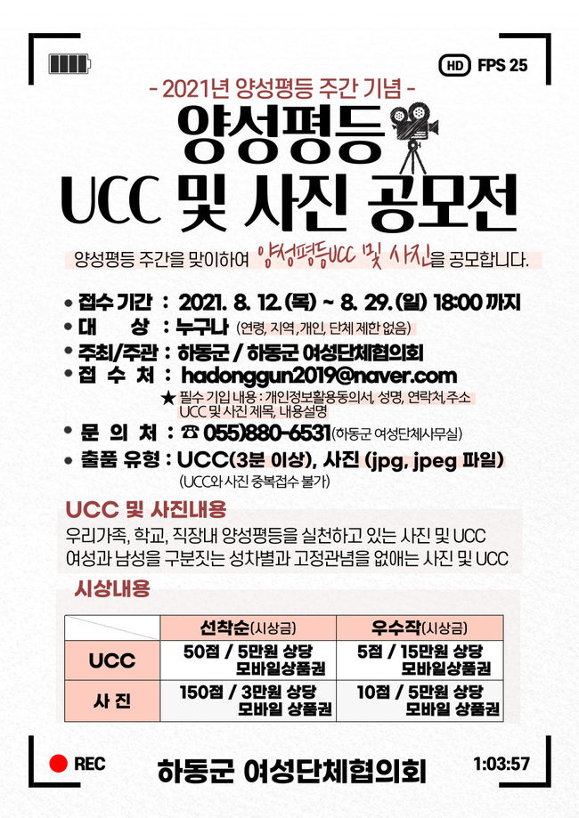 심사기준으로 작품 내용의 성인지 감수성 정도, 창의성 및 결과물의 활용성 등을 중점 평가하고, UCC 우수작 5점에 15만원 상당의 하동사랑모바일상품권, 사진 우수작 10점에 5만원 상당의 하동사랑모바일상품권을 지급한다.