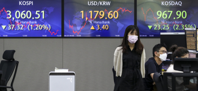 20일 코스피지수는 전 거래일(3097.83)보다 37.32포인트(1.20%) 내린 3060.51에 마감했다. 이틀째 큰 폭으로 떨어지면서 종가 기준 지난 3월29일(3036.04) 이후 가장 낮은 수준으로 내려갔다.