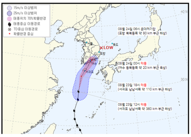 이 비는 내일(24일)까지 북상하는 태풍과 서해상에서 다가오는 저기압의 영향으로 전국에 많은 양의 비가 내릴 것으로 보인다.