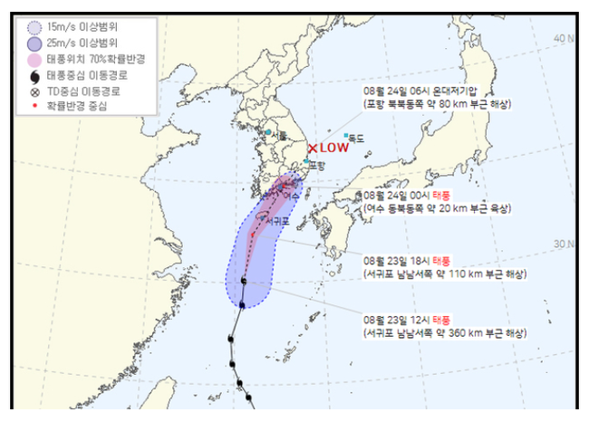 23~24일 예상 강수량은 남부 지방·제주도의 경우 100~30㎜다. 남해안·지리산 부근에선 400㎜ 이상이 내리는 곳도 있겠다.
