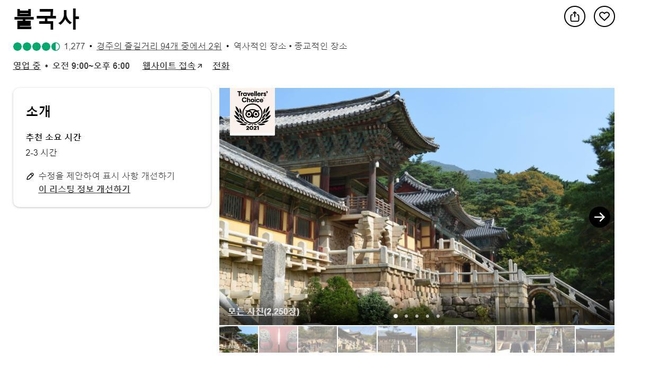 전세계 1위 여행전문 사이트 트립어드바이저(Tripadviser)는 매년 약 9억여 건의 여행자들의 긍정적인 리뷰와 의견을 기반으로 전세계 상위 10%의 우수한 여행지를 선정하여 ‘트래블러스 초이스 어워드(전세계 여행자 선정 관광지)’를 발표한다. 그 중 유네스코 세계문화유산인 불국사가 2021년 ‘트래블러스 초이스 어워드’에 선정되는 기쁨을 누렸다.