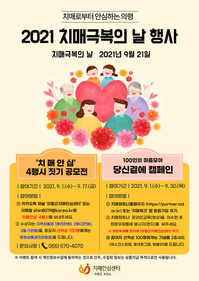 먼저 ‘치매안심’ 4행시 짓기 공모전은 9월 1일부터 17일까지 치매극복과 관련된 ‘치매안심’이란 글자로 4행시를 지어 의령군치매안심센터 카카오톡 채널과 이메일을 통해 공모할 수 있다.