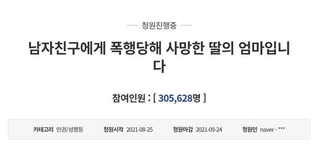 28일 피해여성의 모친이 청와대 국민청원 게시판에 올린 '남자친구에게 폭행 당해 사망한 딸의 엄마입니다'라는 제목의 청원글은 오전 9시께 기준 30만5628명의 동의를 얻었다. 해당 청원글은 20만명 이상의 동의를 받으면서 청와대의 직접 답변을 받게 됐다.