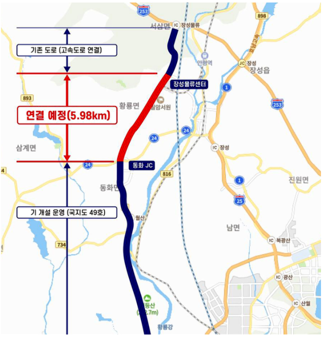 이 도로는 기존 구간을 연장해 '동화JC(분기점)~장성물류센터'까지 직선으로 연결함으로써 이동 거리는 9.1㎞, 운행 시간은 각각 20분 이상 줄일 수 있어 획기적인 물류비 절감과 장성 중부권 균형발전을 촉진할 것으로 기대된다.