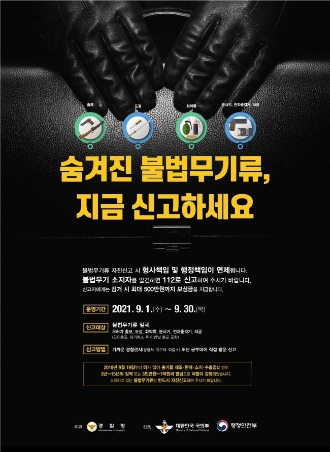 또한, 주변에서 불법무기류를 소지한 사람을 발견한 경우 지체없이 112 또는 가까운 경찰관서에 신고해 줄 것을 부탁하였다.