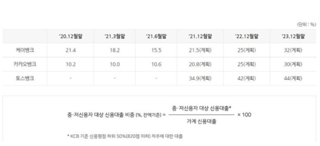 30일 은행연합회 공시에 따르면 카카오뱅크와 케이뱅크의 중저신용대출 비중은 2분기 말 잔액 기준 각 10.6%, 15.5%다. 연말까지 카카오뱅크는 20.8%, 케이뱅크는 21.5%를 목표로 하고 있다. 곧 출범할 토스뱅크는 34.9%를 계획한 상태다.