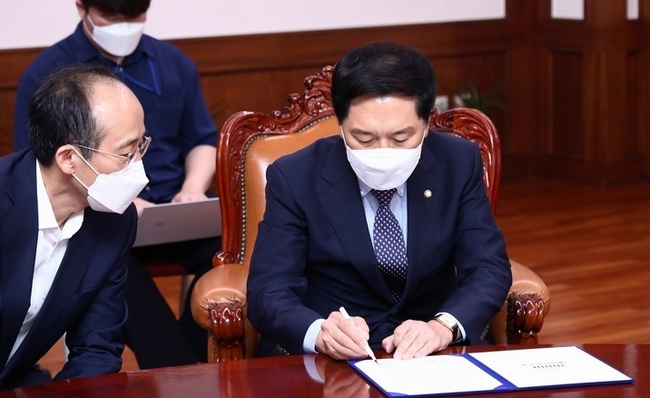 [시사뉴스 홍경의 기자] 김기현 국민의힘 원내대표는 전날 여야가 별도 협의체를 구성해 오는 27일 언론중재법 개정안을 처리하기로 합의한 데 대해 "합의서 문안 자체를 보면, 합의가 안 되더라도 민주당이 추진하고 있는 안을 상정한다는 표현이 없다"며 협의체에서 합의가 안 될 경우 표결에 불참할 가능성을 1일 시사했다.