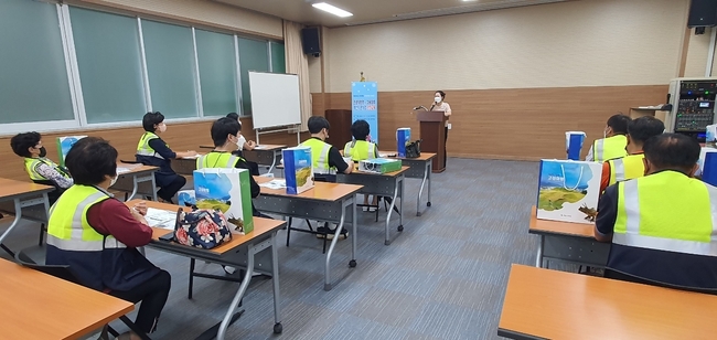 9월 1일 고성박물관 강의실에서 10명의 사업 참여자들을 대상으로 방역관리요원의 역할과 자세, 일터에서의 생활 속 거리두기 및 안전수칙 등을 교육하였으며, 근무지에서 안전하게 근로활동을 할 수 있도록 근로조끼 및 소독제를 배부했다.