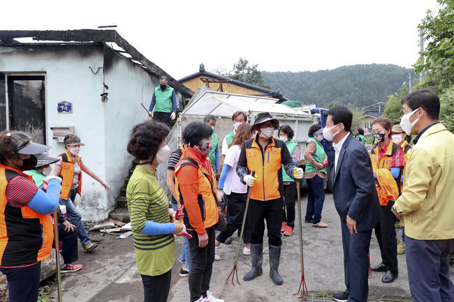 [시사뉴스 정윤철 기자] 합천군수(문준희)는 지난달 31일 쌍백면 원전마을 주택 화재 철거 현장에서 구슬땀을 흘리는 쌍백면 이장단을 비롯한 여러 기관사회단체 회원에게 감사의 인사와 피해자를 격려했다.