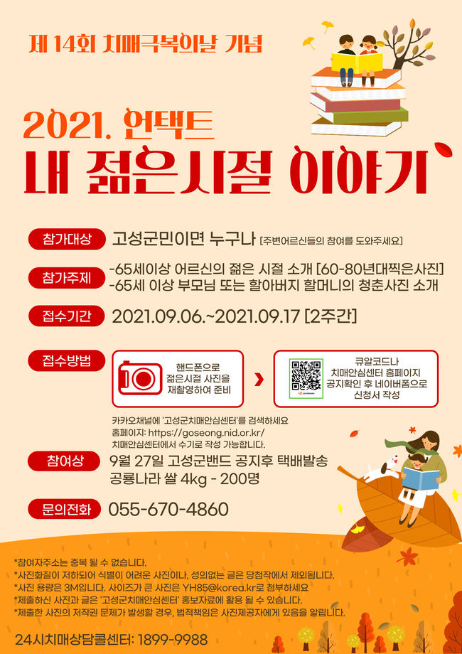 [시사뉴스 정윤철 기자] 고성군(군수 백두현) 치매안심센터는 제14회 치매극복의 날을 맞아 오는 6일부터 17일까지 2주간 비대면으로 ‘내 젊은 시절 이야기 사진 응모전’을 진행한다.