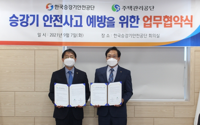 [시사뉴스 정윤철 기자] 한국승강기안전공단(이하 공단)과 주택관리공단이 공공 임대주택 승강기 사고 예방과 안전이용 문화 정착을 위한 업무협약을 7일 체결했다.