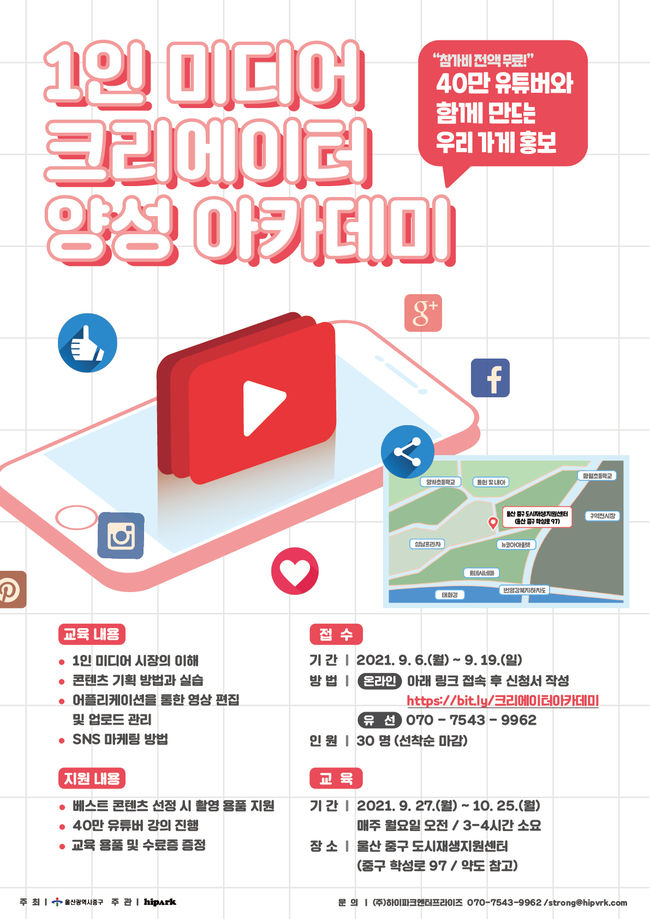 이번 과정은 ‘40만 유튜버와 함께하는 우리 가게 홍보’라는 주제로 ▲1인 미디어 시장의 이해 ▲콘텐츠 기획 방법과 실습 ▲어플리케이션을 통한 영상 편집 및 업로드 관리 ▲SNS 마케팅 방법 등에 대한 내용으로 꾸며진다.