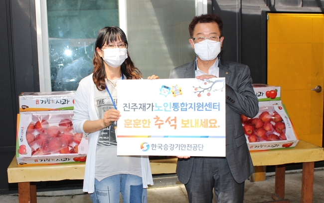 또한 경남 진주시 문산읍에 있는 진주시 재가노인복지센터를 방문하여 경남지역에서 생산한 사과 20박스를 전달했다.