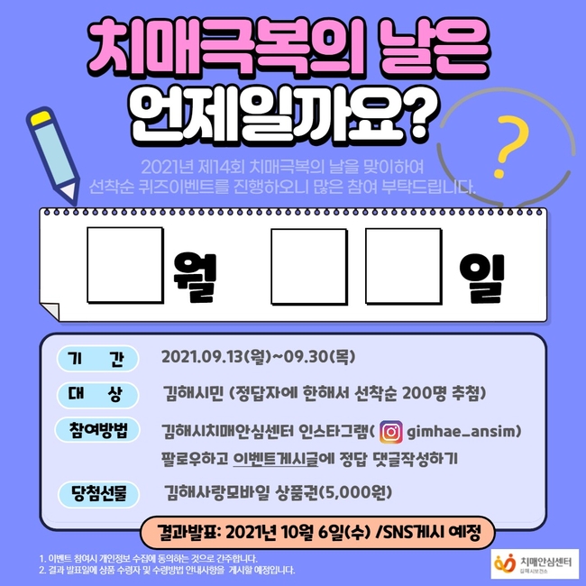 정답자에 한해 선착순 200명에게 김해사랑모바일상품권 5,000원을 지급하며 당첨자 발표는 10월 6일 김해시치매안심센터 인스타그램에 게시할 예정이다.
