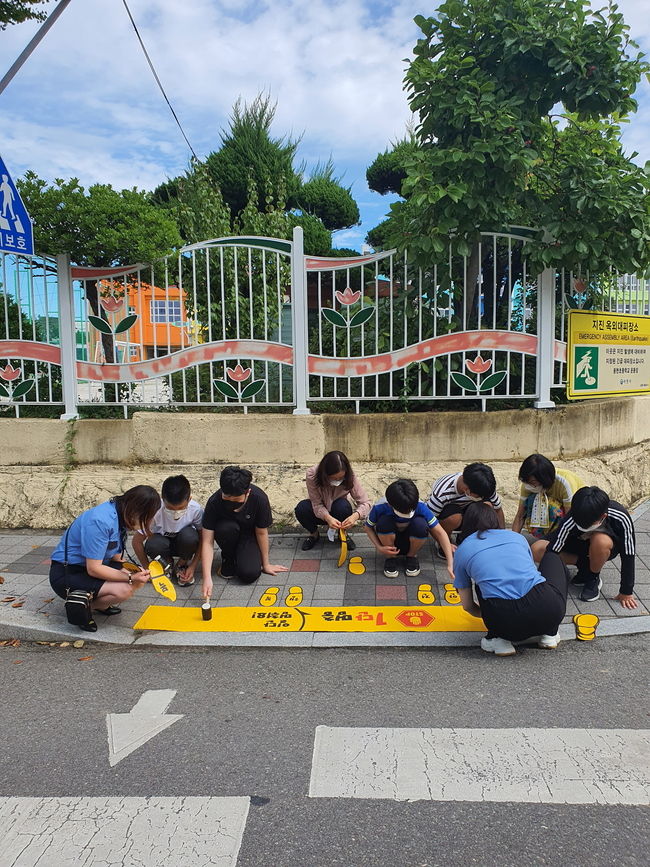 이날 사천시자원봉사센터는 어린이 보행자의 안전한 통학로 확보를 위해 노란 발자국 8곳 설치, 포인트 마크 50곳 부착, 노란 깃발 20개 설치했다.
