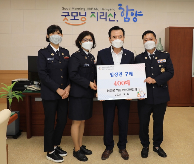 [시사뉴스 정윤철 기자] 함양군은 지난 8일 군수실에서 서춘수 함양군수, 함양군의용소방대연합회 김기종 남성대장, 김용옥 여성대장, 장금향 사무국장 등이 참석한 가운데 2021 함양산삼항노화엑스포의 성공적 개최를 기원하며 엑스포 입장권 400매 구매식을 가졌다.
