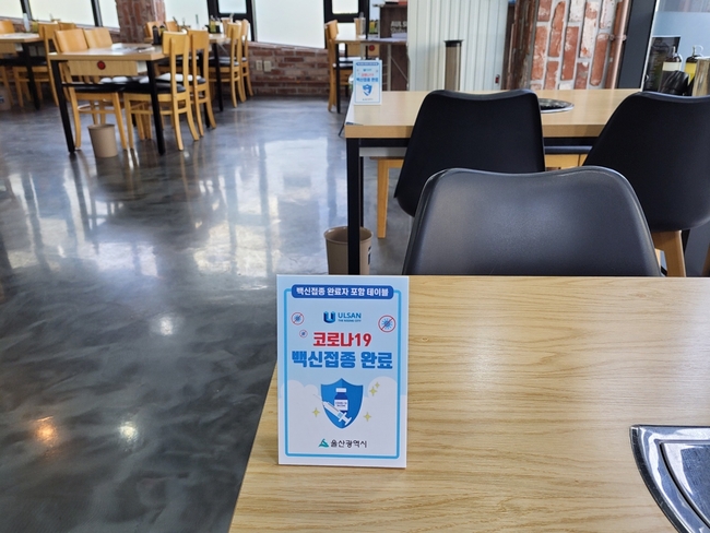 [시사뉴스 정윤철 기자] 울산시는 식당·카페 등에서 코로나19 예방접종 완료자(예방접종 2차 접종 후 14일 경과) 포함 테이블임을 안내하는 ‘안내 팻말’을 제작 오는 13일부터 배부한다고 밝혔다.